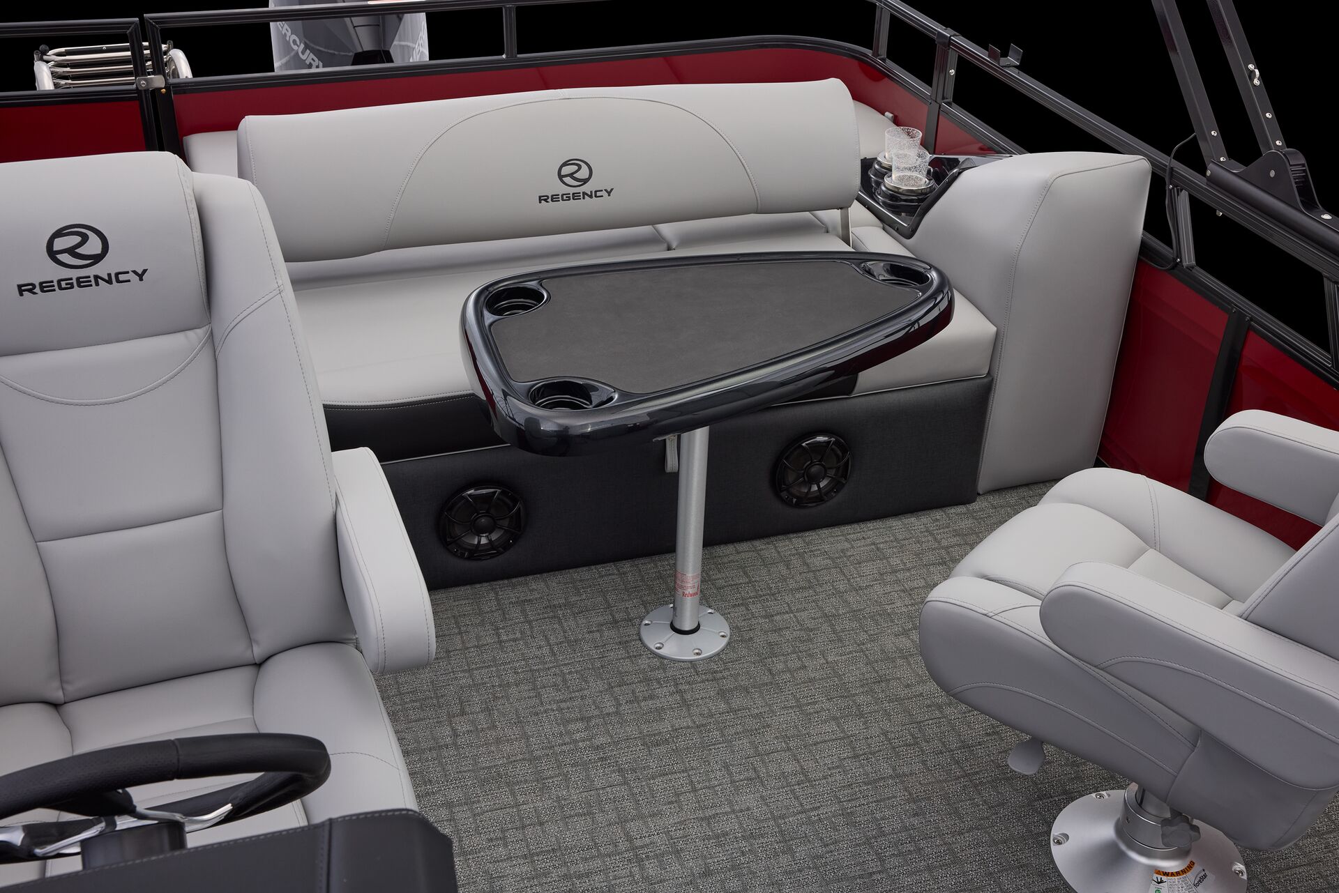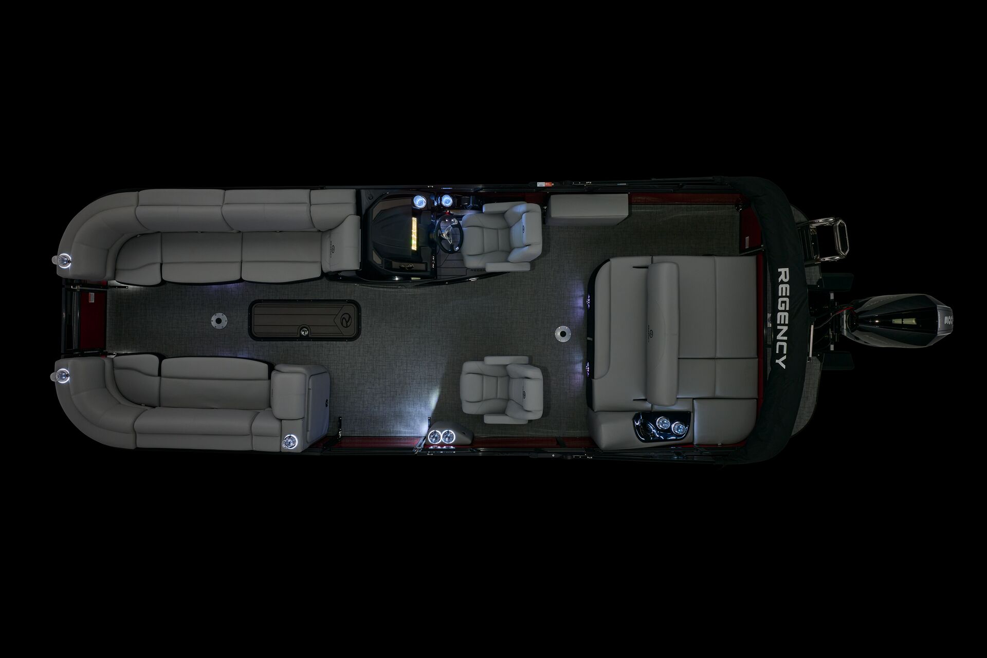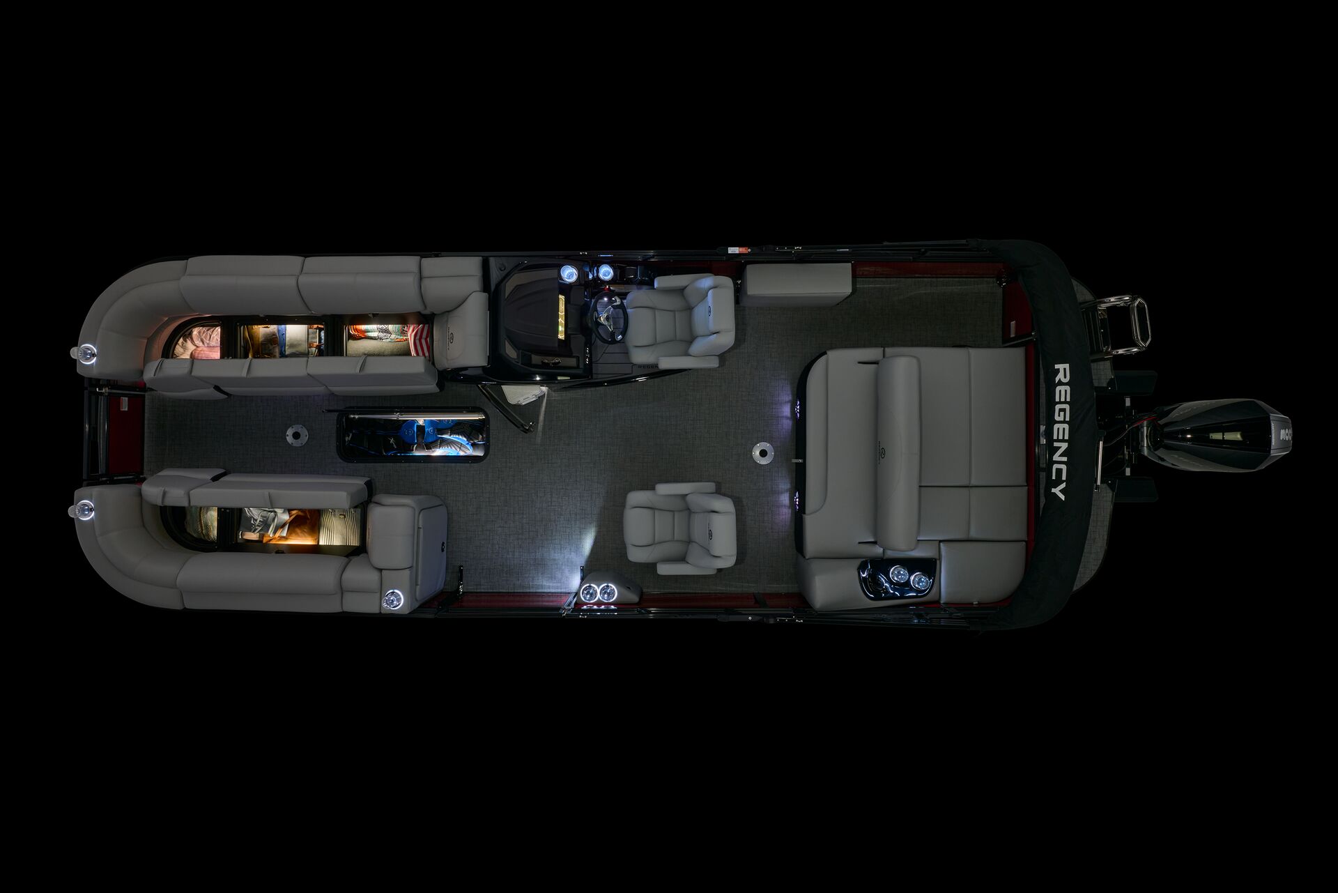 Le navigateur bénéficie de la tablette tactile « REGENCY® omni2™ 12″ touchscreen » permettant de contrôler le bateau. Il pourra également prendre le contrôle du système audio Wet Sounds® et dispose d’un chargeur sans fil Scanstrut®. Autant d’équipements qui font de la navigation un moment sophistiqué et intuitif.