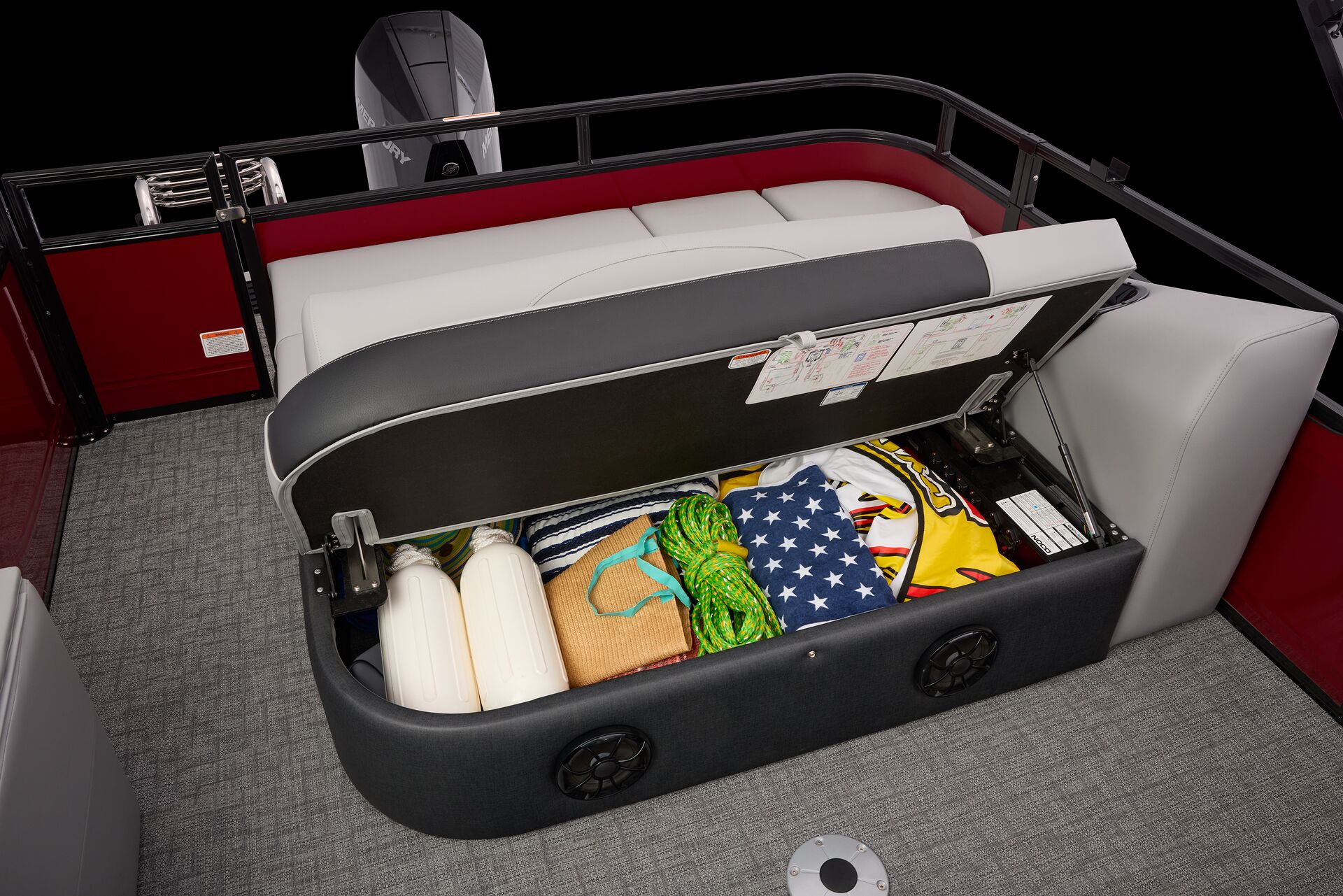 L’intérieur raffiné mêle vinyle tissé haut de gamme, coussins à dossier rembourré avec soutien lombaire, et des systèmes de rangements silencieux pour une organisation optimale de l’espace à bord. L’extérieur impressionne par la délicatesse de ses contours. Une clôture élégante et la célèbre finition « DIAMOND COAT™ 3.0″, donnant un aspect brillant au bateau. L’intégral de l’éclairage est synchronisable avec la musique vous permettant de créer une ambiance festive sur l’eau.