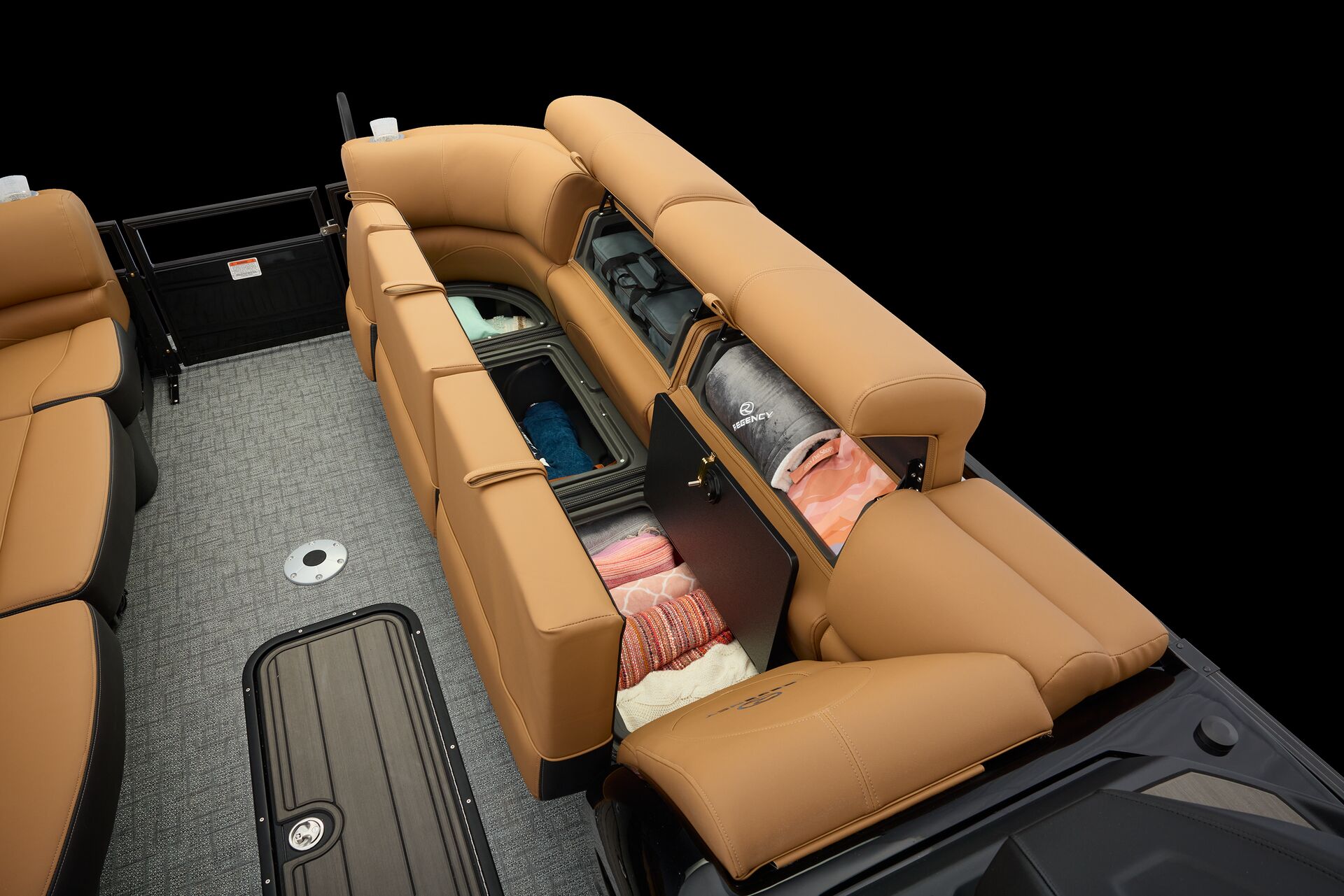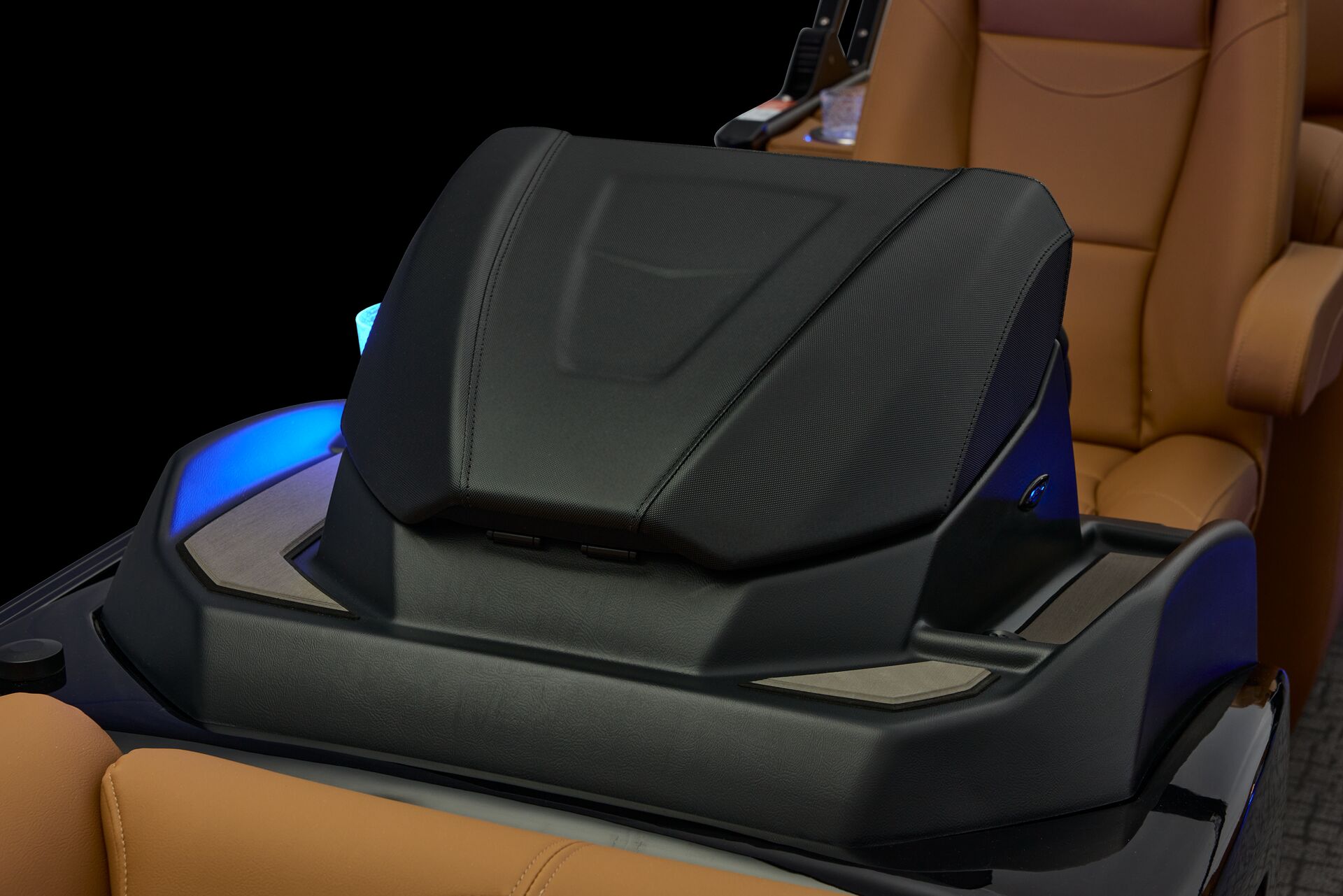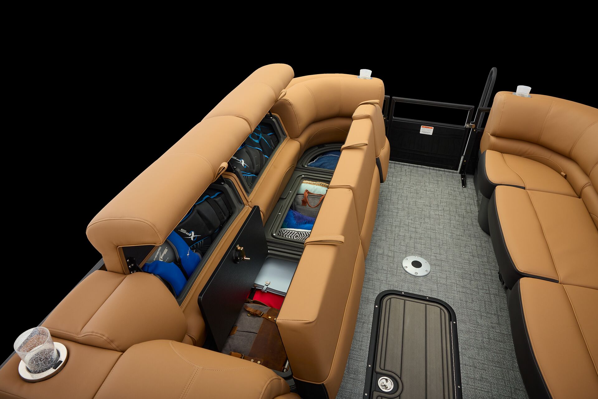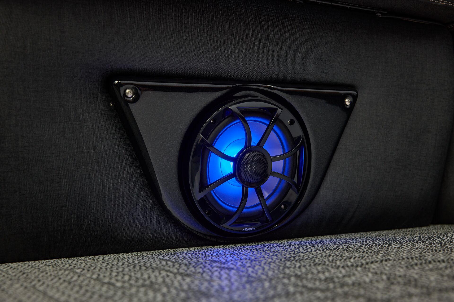 Son design distinctif s’illustre par sa clôture audacieuse et sa finition durable DIAMOND COAT™ 3.0, tandis que le système d’éclairage RGB synchronisé avec votre musique crée une ambiance personnalisée à bord sans déranger vos voisins sur les plans d’eau. À bord, les canapés profonds avec leurs dossiers rembourrés, le revêtement vinyle tissé premium au sol ainsi que les charnières de coffre silencieuses invitent à la détente et à l’organisation optimale de vos affaires. Ranger et récupérer vos affaires sans avoir à déranger vos amis.